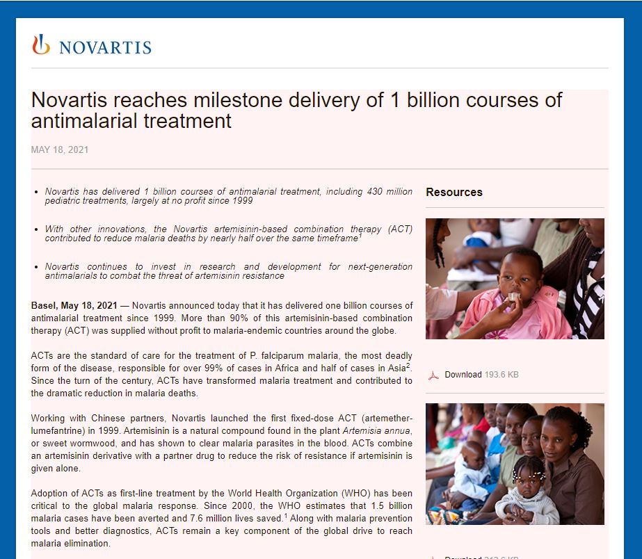 - Novartis has delivered 1 billion courses of antimalarial treatment, including 430 million pediatric treatments, largely at no profit since 1999