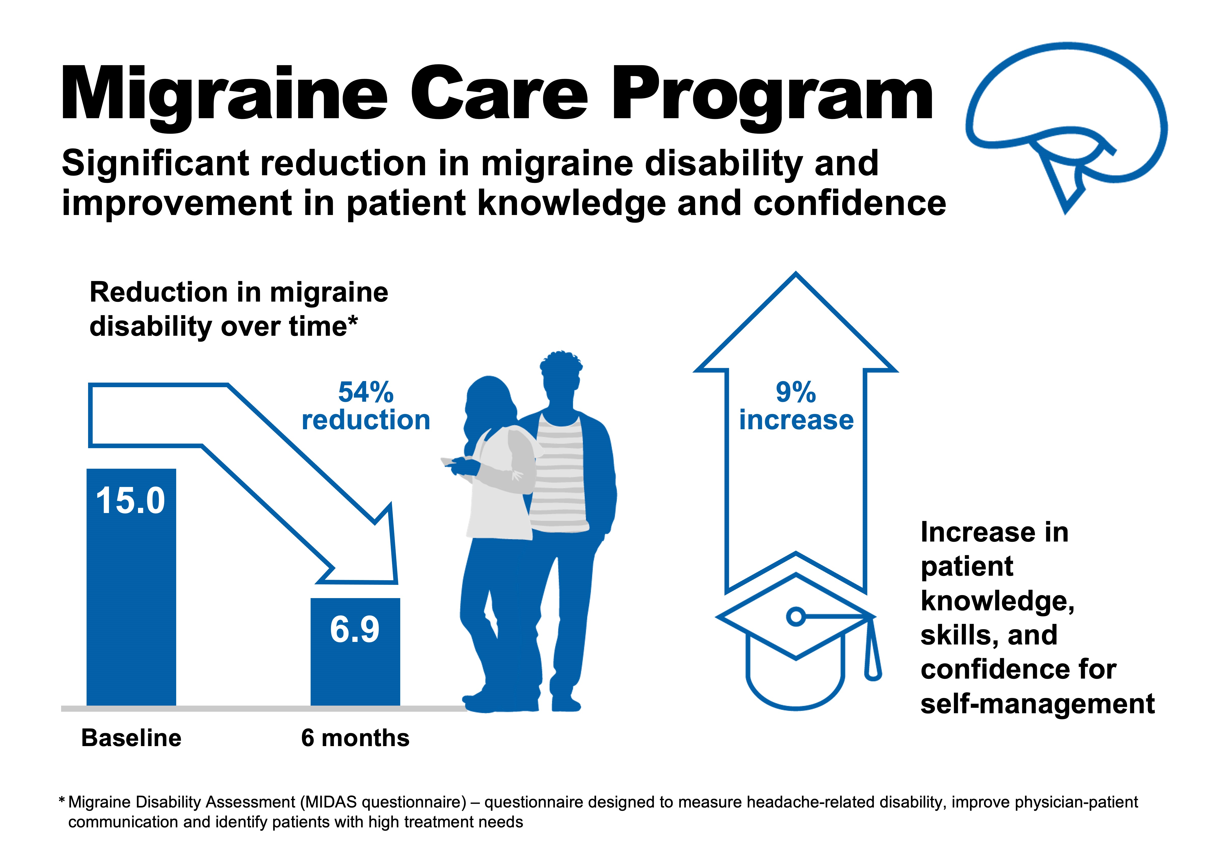 - The patients that completed the Migraine Care pilot program reported over 50% reduction in migraine disability and a significant improvement in their patient activation measure after six months